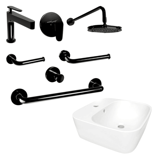 Paquete Obsidiana Santorini Monomandos + Regadera + Accesorios y Lavabo Helvex OB-SANTORINI1