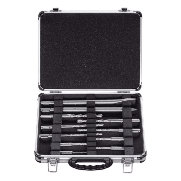 - 1 cincel puntiagudo SDS plus de 250 mm, 1 escoplo plano SDS plus de 250 mm, 9 brocas para martillo SDS plus-1 (5, 6, 6, 7, 7, 8, 8, 10, 12 mm)