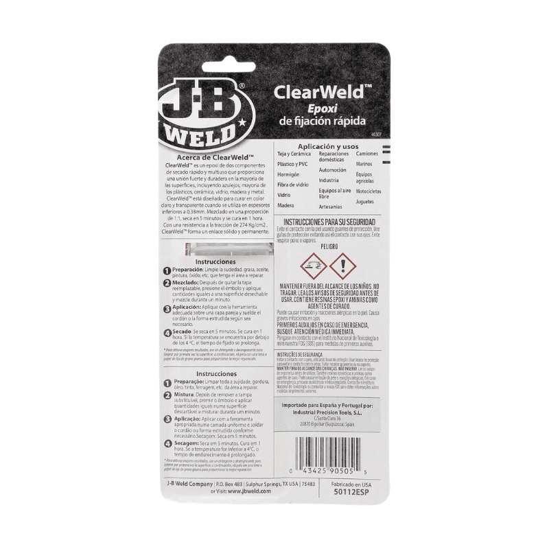 - ClearWeld ™ tiene una proporción de mezcla de 1: 1, fragua en 5 minutos y cura en 1 hora