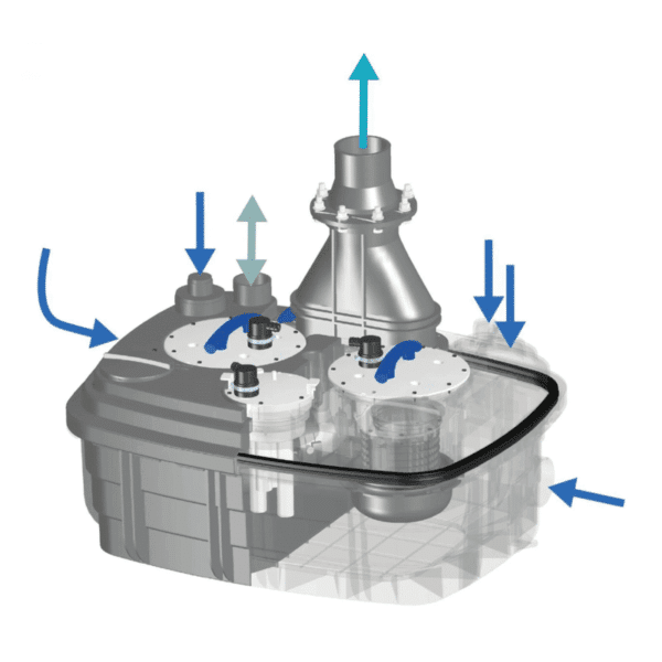 - Potente estación de bombeo equipada con dos motores y diseñada para uso intensivo, ideal para instalaciones donde se generan grandes volúmenes de aguas grises