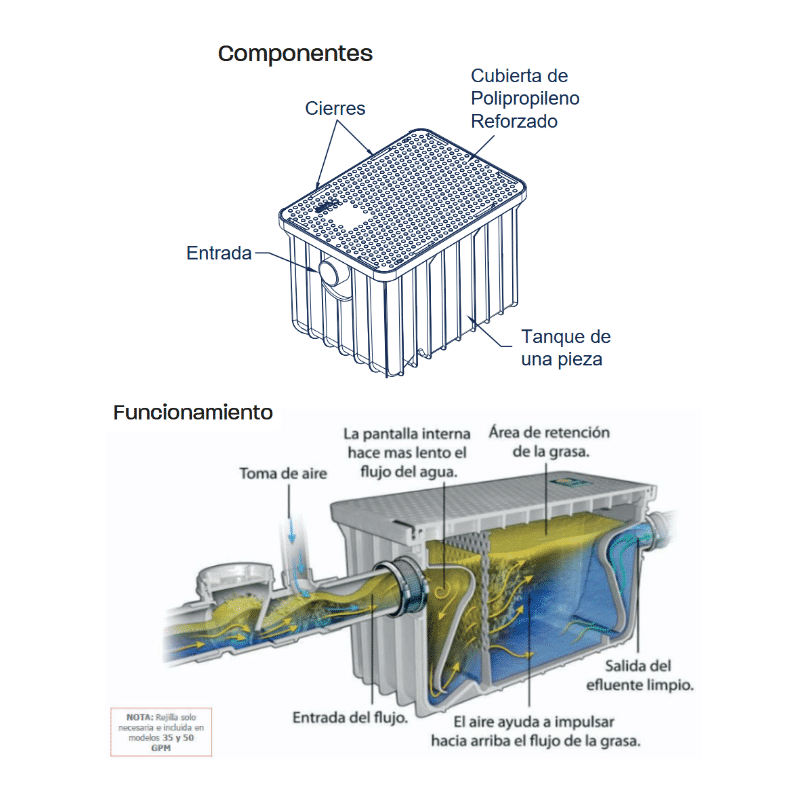 - Ayuda a una correcta eficiencia de la trampa de grasa, separando los sólidos antes de llegar a la trampa