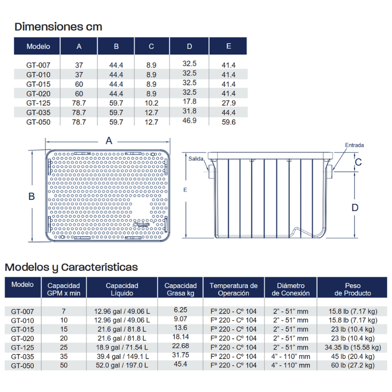 - Compatible con las trampas de grasa Coflex GT-007, GT-010, GT-015, GT-020, GT-0125