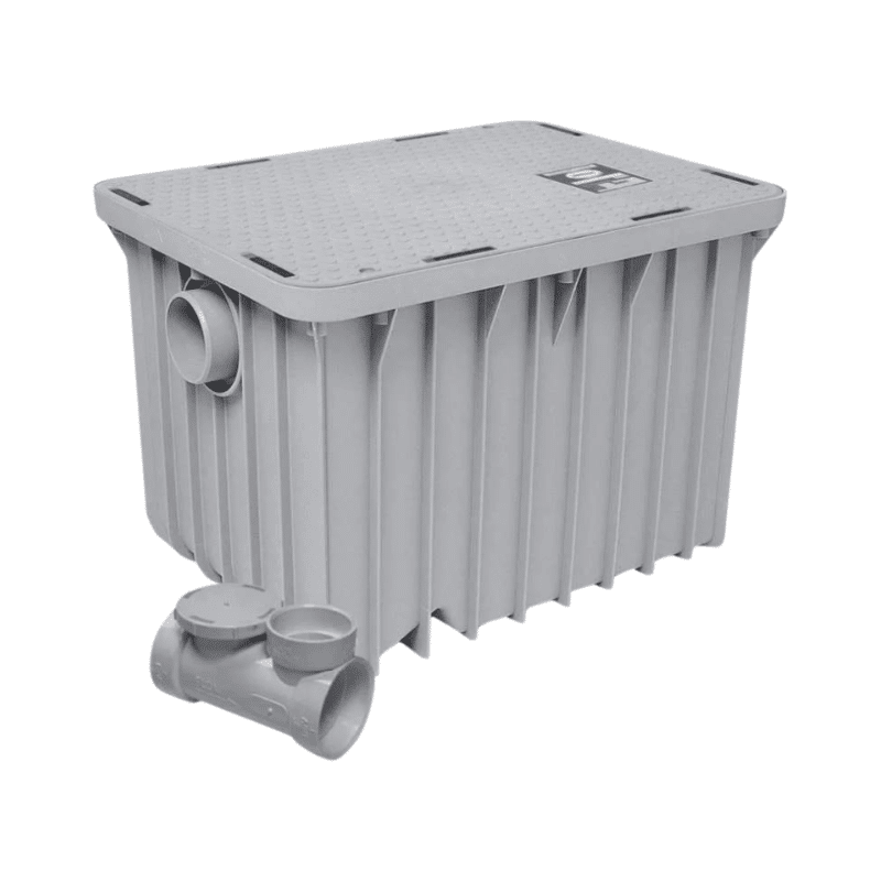 - Interceptor de grasa con canastilla para sedimentos sólidos de 45 L/min y 18 kg de capacidad.
